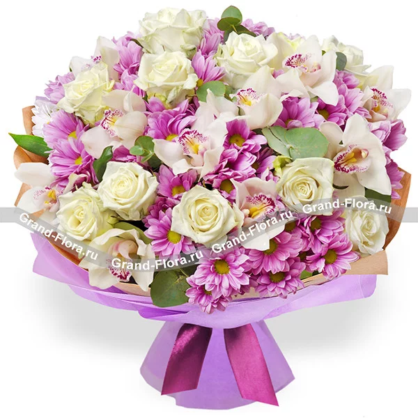 Стандартный: орхидея - 3 шт., хризантема кустовая сиреневая - 5 шт., роза белая - 5 шт., декоративная зелень., упаковка, лента.