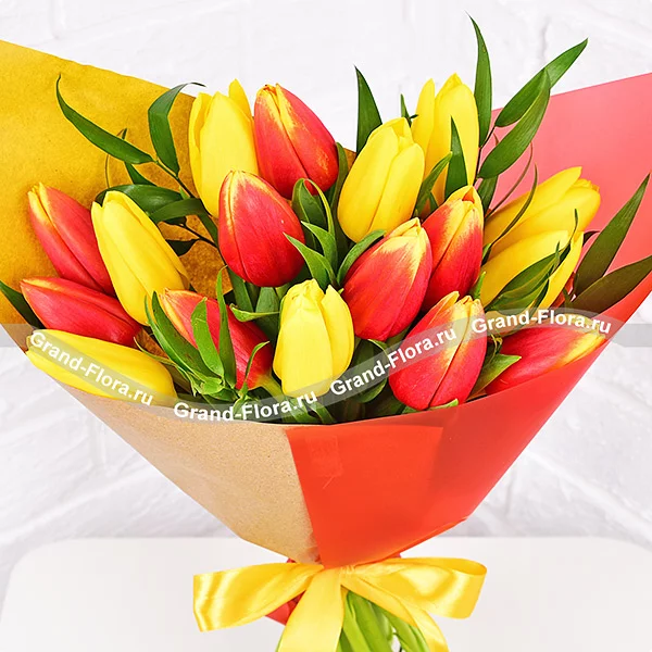 9 тюльпанов: желтые и оранжевые тюльпаны - 9 шт., упаковка, лента.